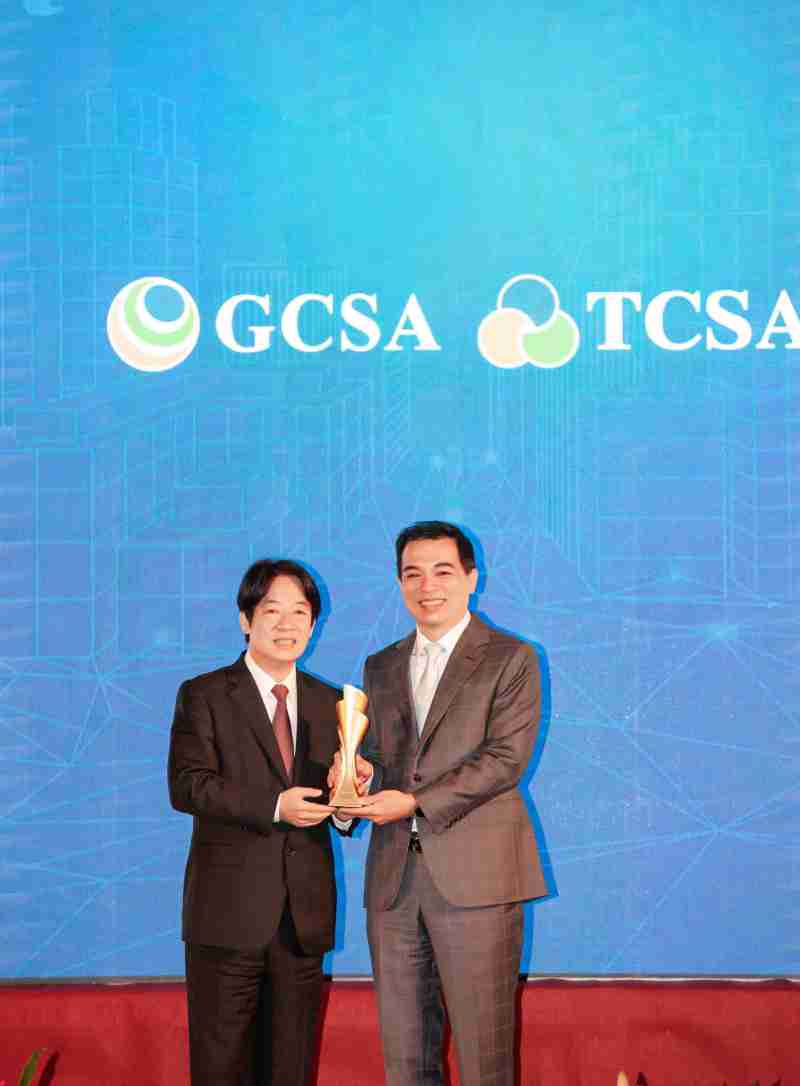 达全方位永续表现获全球永续奖及台湾永续奖肯定,,,由副总统赖清德颁奖 (左),,糖果派对总经理柯富仁 (右) 代表领奖